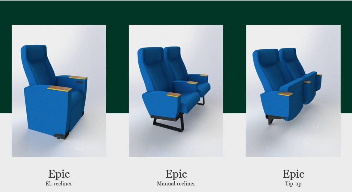 Epic-serien tilbyr samme flotte skandinaviske designuttrykk i hele salen om en vil kombinerer el-reclinere, manuell reclinere og tip up seter.